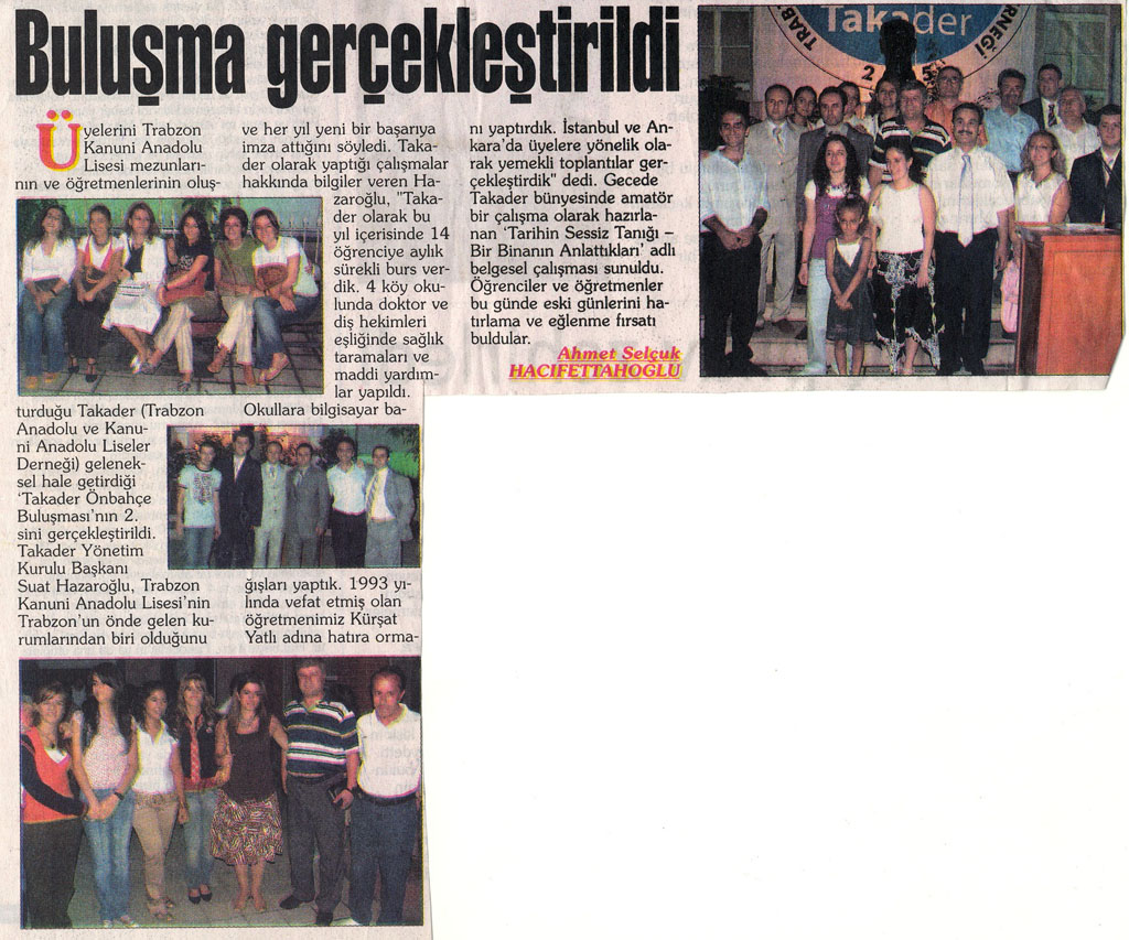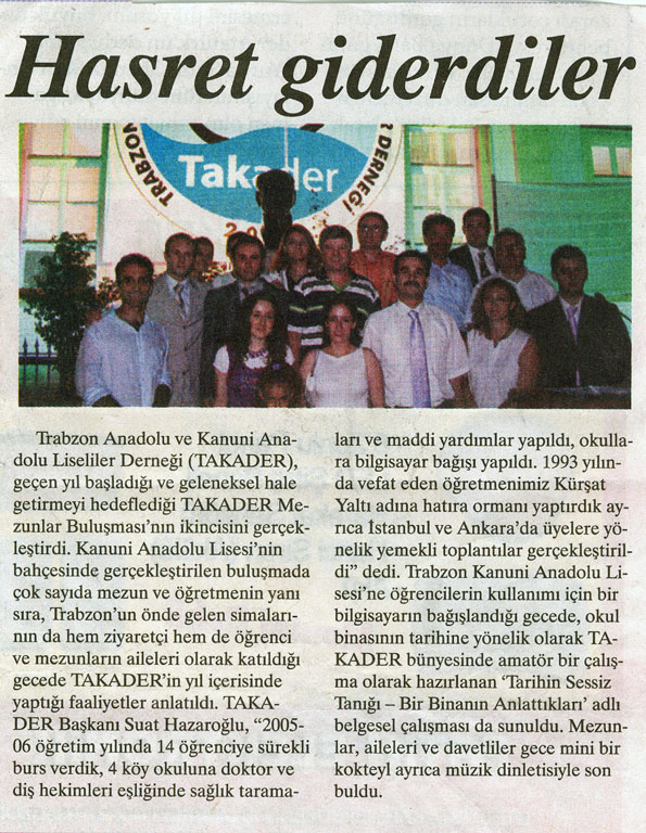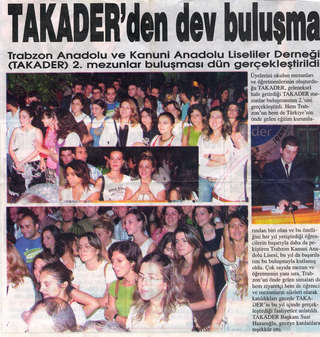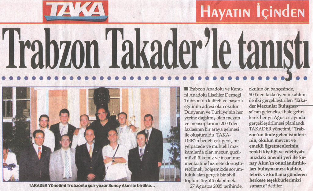 Mezunlarımızın birbirleriyle iletişim ve paylaşım ortamı olarak www.talme.com internet sitesiyle hareketlenen bir araya gelişi, bir noktadan sonra dernekleşerek bir tüzel kişiliğe bürümek ihtiyacı doğurmuştur. Nihayet hep dilimizde olan bu dernek, Trabzon Kanuni Anadolu Liseliler Derneği (kısa adıyla TAKADER) adıyla 15.04.2005 tarihinde resmen kurulmuştur.